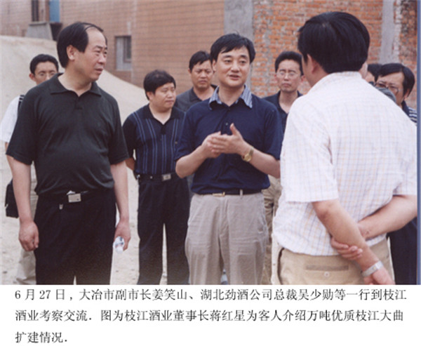 6月27日,大冶市副市長(zhǎng)姜笑山、湖北勁酒公司總裁吳少勛等一行到枝江酒業(yè)考察交流。圖為枝江酒業(yè)董事長(zhǎng)蔣紅星為客人介紹萬(wàn)噸優(yōu)質(zhì)枝江大曲擴(kuò)建工…
