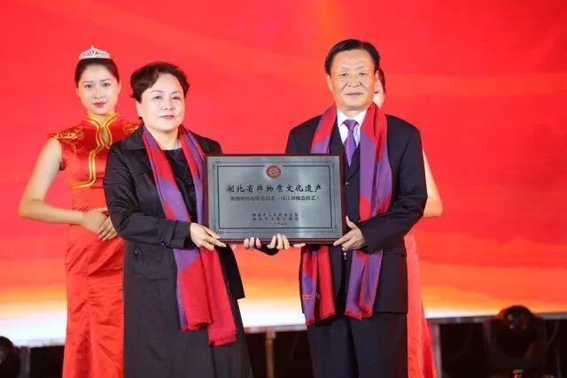 宜昌市非遺中心主任林鴻為枝江酒業(yè)授予湖北省第五批非物質(zhì)文化遺產(chǎn)保護(hù)名目的匾牌